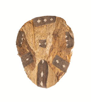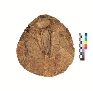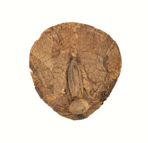 Nahezu eiförmige, aus Bananenblättern zusammengenähte Scheibe mit Knauf an Innenseite, der zur Befestigung des negbe am Hüpftband dient, rautenförmige Verzierung mittels Aplikation, die sich durch dunklere Farben absetzen