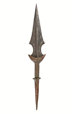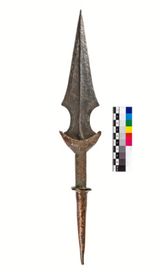 schmaler, unten spitz zulaufender Griff, läuft nach 11 cm leicht wulstig aus, darauf rundes Metallplättchen, darauf 8 cm langes Griffstück, das zu Sichel ausläuft, darauf Klingenstück, das knochenförmig ausläuft, wird dann zu spitz zulaufender Klinge, 4 linienförmige, parallele Gravuren, die beidseitig der Außenseite der Klinge folgen, eingeklopfte Punkte am Griff