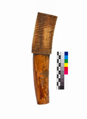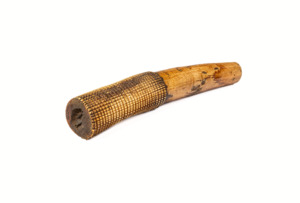 Der sich nach oben verbreiternde Griff geht über in den etwas breiteren Klopfer, der mit rasterförmigen Kerben versehen ist. Gebilde ist oben und unten flach abgeschnitten. Die oberen 10 cm flächig mit rasterförmigen Einkerbungen verziert.