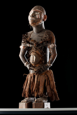 Holzfigur, Hände in die Hüften gestützt, Nägel, Klingen, Schrauben auf Brust, Bauch und Schultern, Augen: Muschel oder Keramik, Raphiastoffbündel als Rock, große Kaurischnecke als "Nabel", farbig gefasst; aus der Gruppe der nkisi nkondi (Mangaaka)