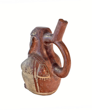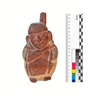 Gefäß in Form eines Menschen, der die Arme über Kreuz auf seine Schultern legt, weiße Bemalung