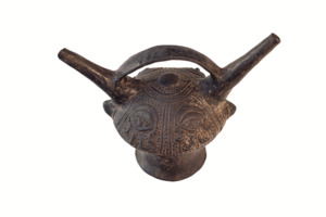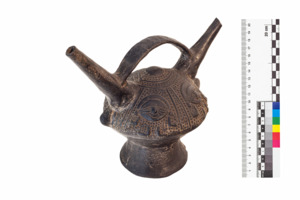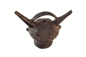 Gefäß mit zwei Ausgießröhren, verziert mit Punkten und Gesichtern