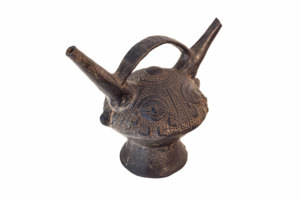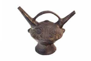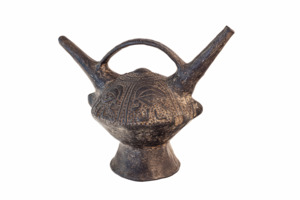 Gefäß mit zwei Ausgießröhren, verziert mit Punkten und Gesichtern