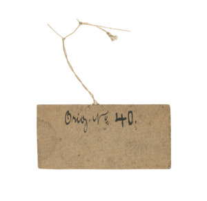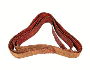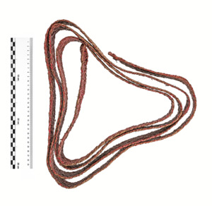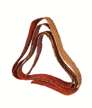 geflochten aus 2 farbiger Pflanzenfaser, die eine Seite mittelbraun, die andere Seite rotbraun, die Enden abgerundet, mit den Restfaden der Pflanzenfaser eingefasst