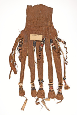 Hüftschurz aus Baststoff, nach unten hin 5 breite Baststreifen und dazwischen Dünne und Kürzere, die breiten Baststreifen sind mit Nassamuscheln umrandet und an den Enden mit Teilen von Conusmuscheln und schwarze Früchten geschmückt, an den kürzeren Baststreifen ist Fell, Nassamuscheln und schwarze Früchte, halbierte Koixkörner