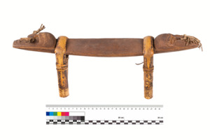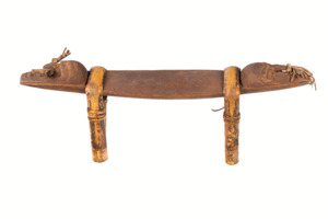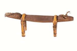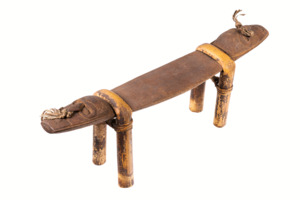 an beiden Enden geschnitzte Gesichter mit Nasenschmuck aus Pflanzenfasern, die Kopfstütze wird von Beinen aus gebogenem Ratan gehalten