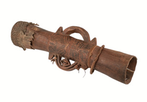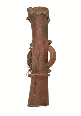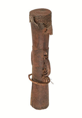 Sanduhrförmiger, leicht ovaler, röhrenartiger Trommelkorpus, einfellig bespannt (Klebspannung), Ornamentschnitzerei im Mittelteil, zwei mittig gegenüberliegende Griffe, einer mit eingearbeitetem Augensymbol, rote Farbreste, ornamentale Griffverzierung