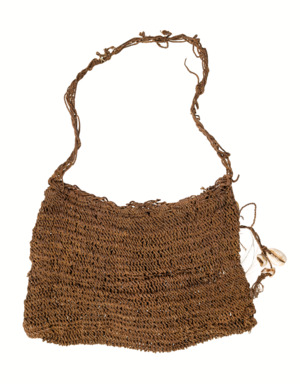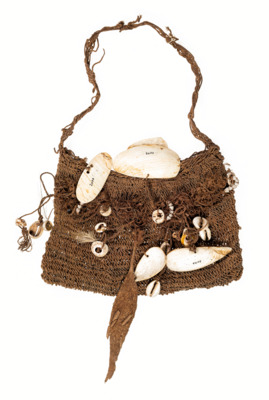 Netztasche aus Pflanzefasern in Schlingtechnik, am oberen Rand: große Muschelstücke, darunter ein Zierstreifen mit Kaurischnecken-Schnecken, Koixkörnern und blauer Perle, weiter unten Feder und Muschelschale