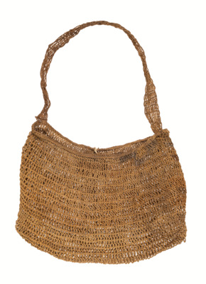 Netztasche aus Pflanzenfaser in Schlingtechnik, in verschiedenen Brauntönen, 5 rote Perlen sind am oberen Teil der Vorderseite mit eingeschlungen