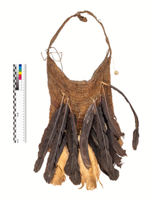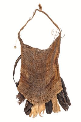 Netztasche zum Umhängen, ein Träger, oben verknotet, 22 eingeflochtene schwarze und weiße Schwungfedern