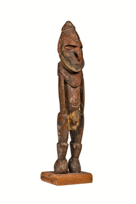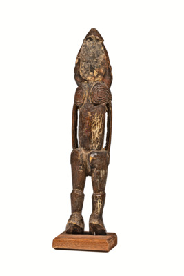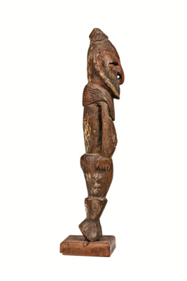 schmuckartige Verzierung, von Schulterblättern bis Brust reichend, Kopf mit schnabelartiger Nase (durchstochenes Septum), Bart oder Gesichtsrahmen, Angedeuteter Kopfschmuck, Figur steht auf Zehenspitzen