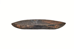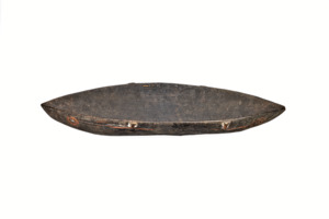 spitz-ovale Schüssel aus leichtem, schwarzgemaltem Holz, schlichte Verzierung an der Außenseite, vier gegenüberliegende "Zapfen" und vier runde Ornamentscheiben (D 3-4cm) mit Sonnen- oder Sternsymbolik, Reste roter und weißer Farbe