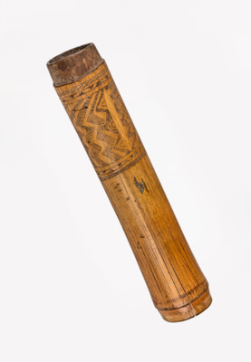 Büchse ist an der Unterseite durch einen Bambudknoten verschlossen, die Oberseite ist offen, die obere Seite ist auf ca 2 cm Höhe mit einer einfachen geometrischen Gravur beschnitzt, um einen Deckel aufzubringen (Deckel fehlt)