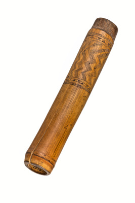 Büchse ist an der Unterseite durch einen Bambudknoten verschlossen, die Oberseite ist offen, die obere Seite ist auf ca 2 cm Höhe mit einer einfachen geometrischen Gravur beschnitzt, um einen Deckel aufzubringen (Deckel fehlt)