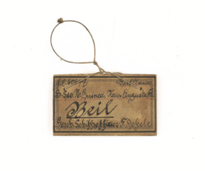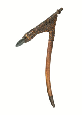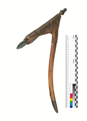 spitzhackige Steinklinge (sehr glatt) in dreiteiliger Kniestielschäftung (bzw. Klemmschäftung mit an-getztem Kniestiel), die Einzelteile sind mit Rotang umbunden (Leinwandbindung), Ringmuster am unteren spitzzulaufenden Stielende