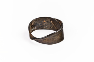 zwei längliche Teile, unten zusammengebunden, können oben auseinander gezogen und so durch das Ohrläppchen gesteckt werden