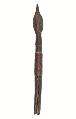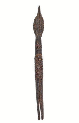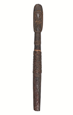 der Halter für den Sagotrog hat am oberen Ende zwei Gesichter (beschnitzt) und am unteren Ende eine Spaltung, in der Mitte ist er mit Rotangstreifen umwickelt