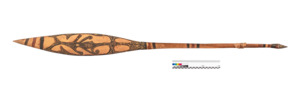 rotbraun und schwarz bemalt, Ruderfläche beidseitig beritzt, größere Flächen ausgehoben