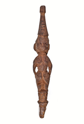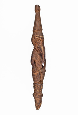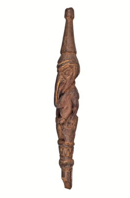 vermutlich Geistwesen oder Ahnenfigur, mit schnabelartiger Nase, die bis zur Brust reicht, die Augen sind auffällig groß, mit spitz zulaufender Kopfbedeckung