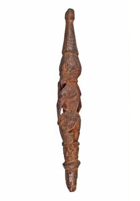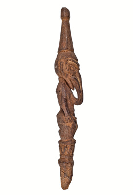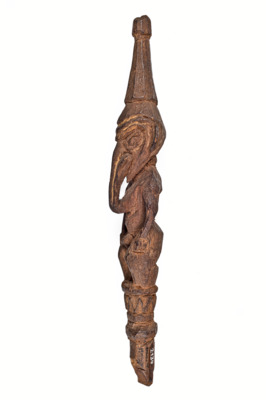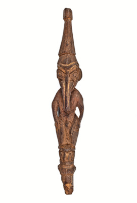 vermutlich Geistwesen oder Ahnenfigur, mit schnabelartiger Nase, die bis zur Brust reicht, die Augen sind auffällig groß, mit spitz zulaufender Kopfbedeckung