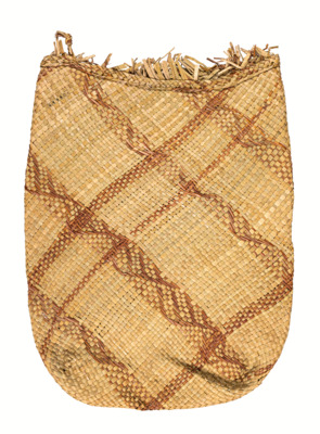 Tasche aus Liane geflochten, ohne Tragegriffe, rautenförmiges, eingeflochtenes Muster aus einer rötlich-braunen Pflanzenfaser, die eine andere Struktur als die hellere Lianenfaser hat