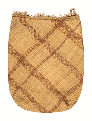 Tasche aus Liane geflochten, ohne Tragegriffe, rautenförmiges, eingeflochtenes Muster aus einer rötlich-braunen Pflanzenfaser, die eine andere Struktur als die hellere Lianenfaser hat