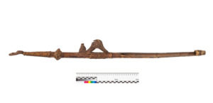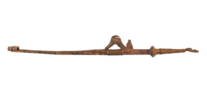 mit Umflechtungen, flach und wulstförmig, sowie figurliche Schnitzerei welche eingestzt ist ins Rundholz, Vogelkopf-Motive