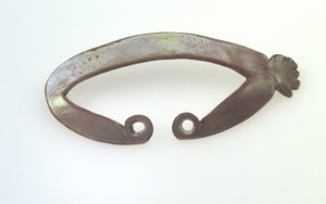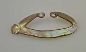 einteilig, oval mit Öffnung unten, in die Enden zur Öffnung hin eingebohrte Löcher, auf der einen Seite ist das Perlmutt blumenförmig erweitert