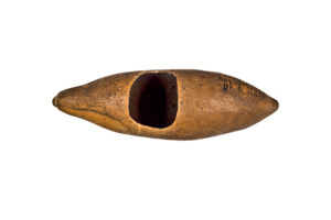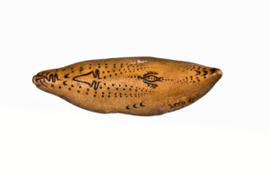 längliches, Sanduhr-förmiges Objekt, Loch mittig, eingraviertes Strichmuster (eingebrannt)