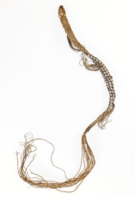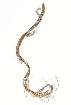 Schmuckband aus Pflanzenfaser geflochten, auf der Oberseite dreireihig mit Koixkörnern besetzt