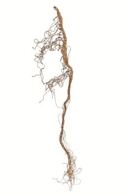 Schmuckband aus Pflanzenfaser geflochten, am unteren Ende des Bandes ist in regelmäßigen Abständen ein loser Faden angebracht, an dem zwei längliche Koixkörner befestigt sind