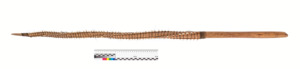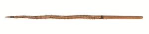 schwach spiralförmiger Besatz des Rundholzes, mit in Holzschienen gelagerten und in ein feines Geflecht eingebundenen jeweils 1x durchbohrten (Haifisch?)-Zähnen