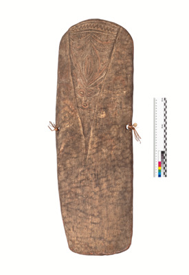 jeweils ein Loch an den Seiten, verziert mit Schnitzereien