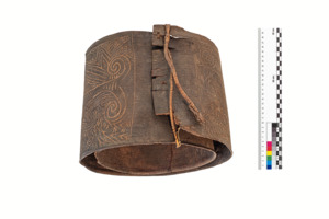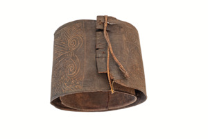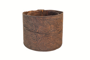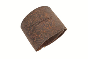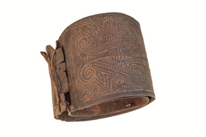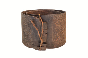 sog. einfacher spiralig biegsamer Rindenpanzer mit zwei Rotangschnüren zum Verschließen/Fixieren, auf der Außenseite mit geschnitzten Ornamenten aus geraden und wellenförmigen Linien
