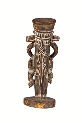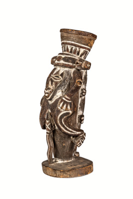 Mörser mit Mensch- und Tierdarstellungen; die Schnitzereien sind weiß gefasst (Pigment, vermutlich Kalk); zum Zerkleinern von Betelnüssen.