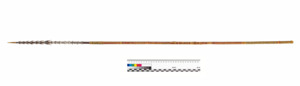 Schaft zur Verzierung mit farbigem Bast umwickelt, Spitze mit vielen Dornen, kranzförmig angeordnet, als Widerhaken und ganz vorne mit gelbem Bast umwickelt