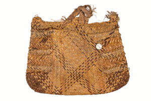 Netztasche aus Liane geflochten, in die hellen Liane-Fäden sind an manchen Stellen dunklere Fäden mit eingeflochten, zwei Handgriffe zum Tragen