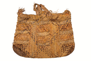 Netztasche aus Liane geflochten, in die hellen Liane-Fäden sind an manchen Stellen dunklere Fäden mit eingeflochten, zwei Handgriffe zum Tragen