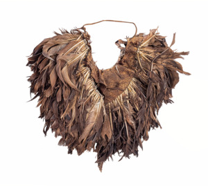 Gesichtrahmen (esidai, nur für Krieger) aus schwarzen Straußenfedern, am Ansatz umgeknickt, Federn aufgeschlitzt und mehrlagig am Lederband aufgefädelt, Mitte des oberen Randes dunkelbraunes Fellstück (L 24 cm), Lederriemen als Verschluß unterhalb des Kinns.
