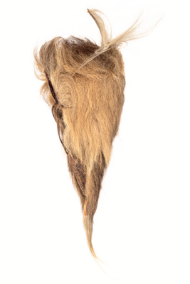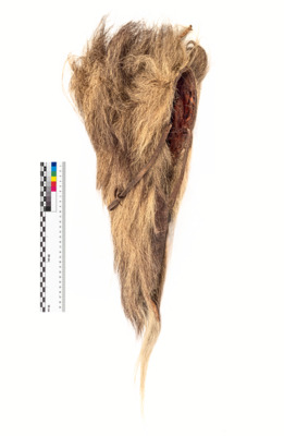 Langgestreckte Mütze aus einer Löwenmähne, über den Rücken der Mütze verläuft ein Fellriemen. Alter Eintrag in Inv.-Buch: Darf nur von Männern getragen werden, die einen Löwen erlegt haben.