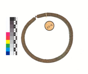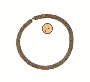 Ein zum Ring gebogener Draht mit zwei ineinandergreifenden Verschlusshaken. Der Ring ist duchgängig mit einem weiteren gedrehten Draht umwickelt.