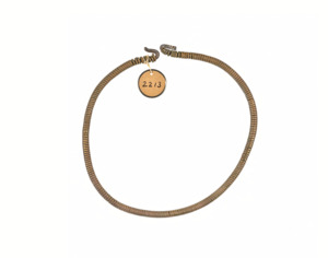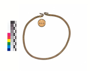 Ein zum Ring gebogener Draht mit zwei ineinandergreifenden Verschlusshaken. Der Ring ist durchgängig mit einem weiteren Draht umwickelt.