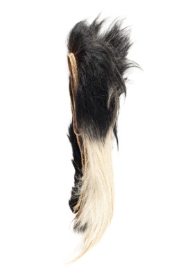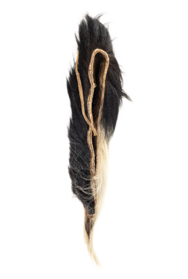 Fell mit Nahtbordüre auf spitz zulaufende Lederbänder genäht, Verschluss durch Lederriemen (L 17 cm) auf der Innenseite, regulierbar durch zwei Einlochungen. Wird von Kriegern unterhalb des Knies getragen.