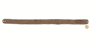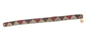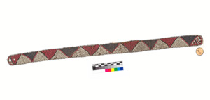 Weiße, schwarze und rote Perlen, Zickzackmuster im Farbenwechsel, Randeinfassung aus abwechselnd schwarzen und weißen Perlen, an den Enden zwei Löcher zwecks Verschluss