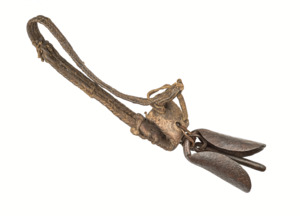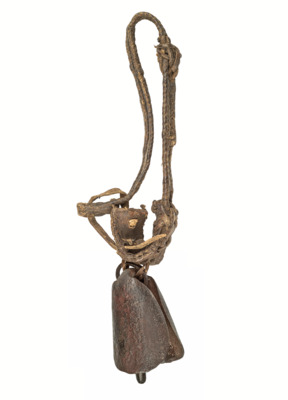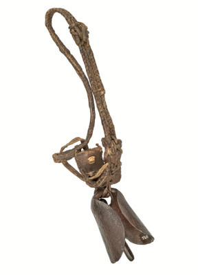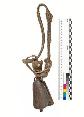 Glocke mit offener Form mit rundem Durchmesser, Halsband in Schlitzriementechnik, nur für Jungtiere. Alter Eintrag in Inv.-Buch: Die Glocken sollen die Tiere vor dem bösen Blick schützen und werden ausschließlich von männlichen Tieren getragen.