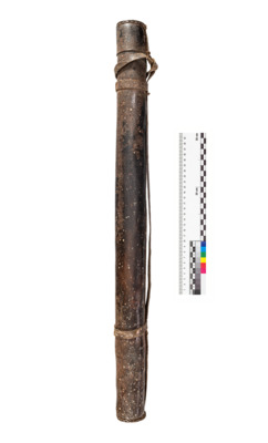 Röhrenförmiger Köcher, Schultertrageriemen mit zwei Hautriemen an der Röhre befestigt, Boden und Deckel eingenäht, Deckel außerdem am Schulterriemen befestigt