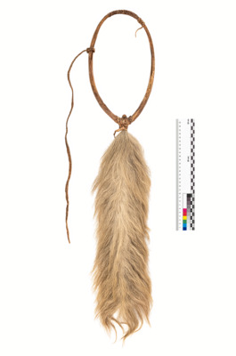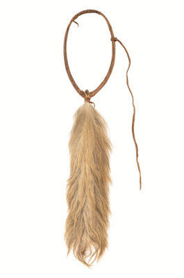 Ovaler Holzrahmen mit Lederband als Befestigung, unten mit Lederband umwickelt, oben langer Aufsatz aus hellem Fell über Holzkern, mit Lederband am Rahmen befestigt