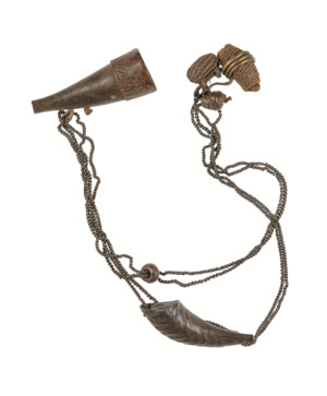 Eisenkette geht durch Horn mit nur einem Loch, Horn mit zwei Löchern hat ein Lederband mit einer Schlaufe am Ende, durch die die Kette läuft, Faserknoten mit Lederband verbunden (Messingspirale), das am Ende geknotet ist, durch Band und Holzperle läuft Eisenkette