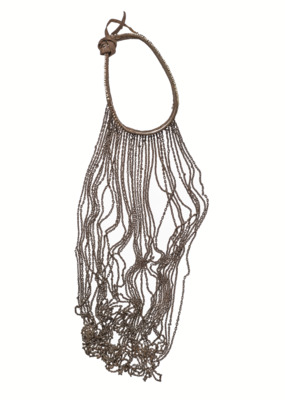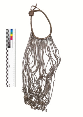 Auf oberen Lederbandrand ist eine Perlenkette, abwechselnd weiß und blau, aufgestickt, unterhalb mit Messingdraht umwickelter Draht, darunter weiße Perlenkette, mittlerer Teil des Bandes mit 34 herunterhängenden Eisenkettchen, gelochte Enden mit Lederriemen verbunden