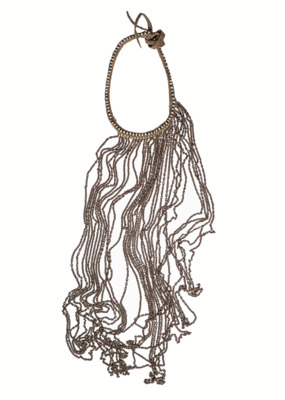 Auf oberen Lederbandrand ist eine Perlenkette, abwechselnd weiß und blau, aufgestickt, unterhalb mit Messingdraht umwickelter Draht, darunter weiße Perlenkette, mittlerer Teil des Bandes mit 34 herunterhängenden Eisenkettchen, gelochte Enden mit Lederriemen verbunden